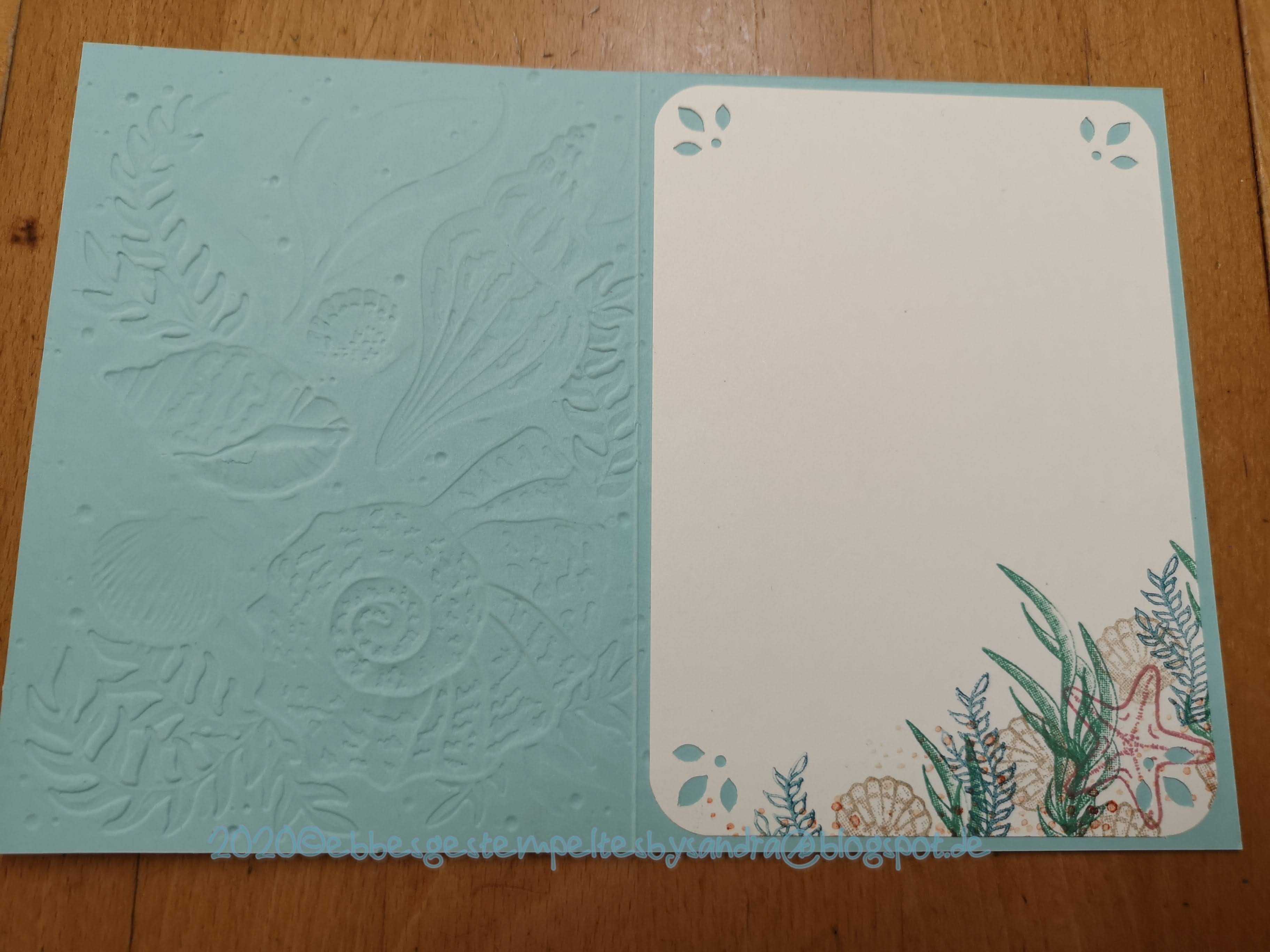 Ich habe den Bogen erst bei jeweils 9,9 cm von rechts und links an der langen Seite gefalzt und dann mit einem der neuen Blending-Pinseln (153611) von Oben her den Hintergrund der Karte gestaltet. Nur vielleicht 4-5 cm hoch habe ich Rauchblau (150085) und Babyblau (147105) gemischt, dann Savanne (147116) und Olivgrün (147090). Das habe ich tatsächlich alles mit ein und dem selben Pinsel gemacht, von hell nach Dunkel geht Prima mit Einem, du solltest nur nicht mit einer Dunklen Farbe in eine Helle gehen, oder mit Blau in Rot oder so. Danach kann der Pinsel ganz einfach ausgewaschen und wieder getrocknet werden. Den Rand habe ich mit der Rindenmaserung aus dem Set Textured Essentials (152612) in Savanne gestempelt.